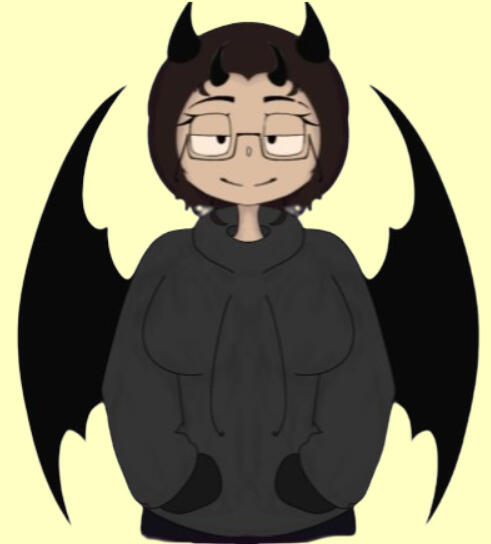 ⎯⎯➢ she has a tail, wings and four small horns, she also has sharp teeth, human appearance was dark skin, long hair, disheveled and tied, its color is brown, like her eyes, and she has 4 strands of brown hair that gets in her face. She wears a gray coat, dark blue jeans, dark brown shoes and gray socks and gloves, she also wears black prescription glasses and is 2 meters tall.