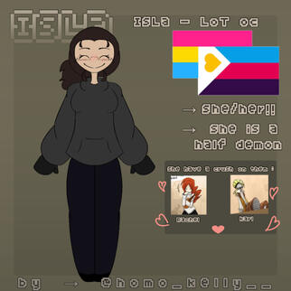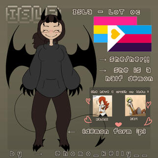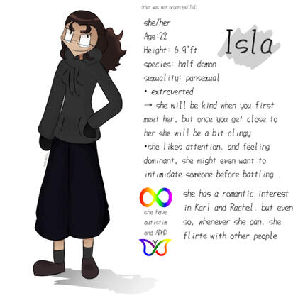 ⎯⎯➢ Isla is a half-demon who loves Karl and Rachel, where she competed in the Law of Talos tournament to find them. She flirts with other people for fun, doesn't care much about the feelings of others (except Karl and Rachel) being a bit narcissistic at times, she is good at fighting, lying, manipulating, but despite all this she tries to be polite, but it's not very good. She also has autism and ADHD